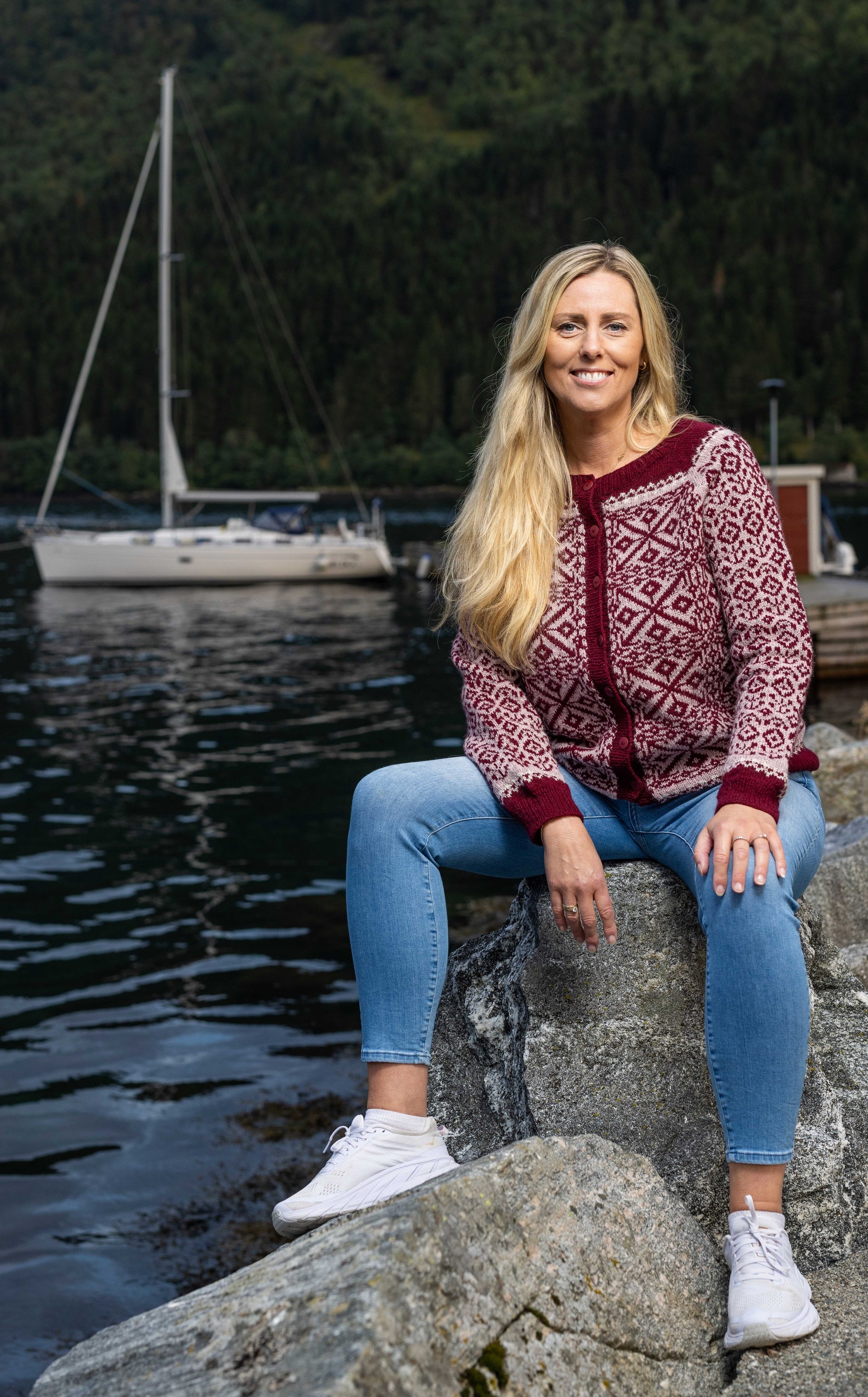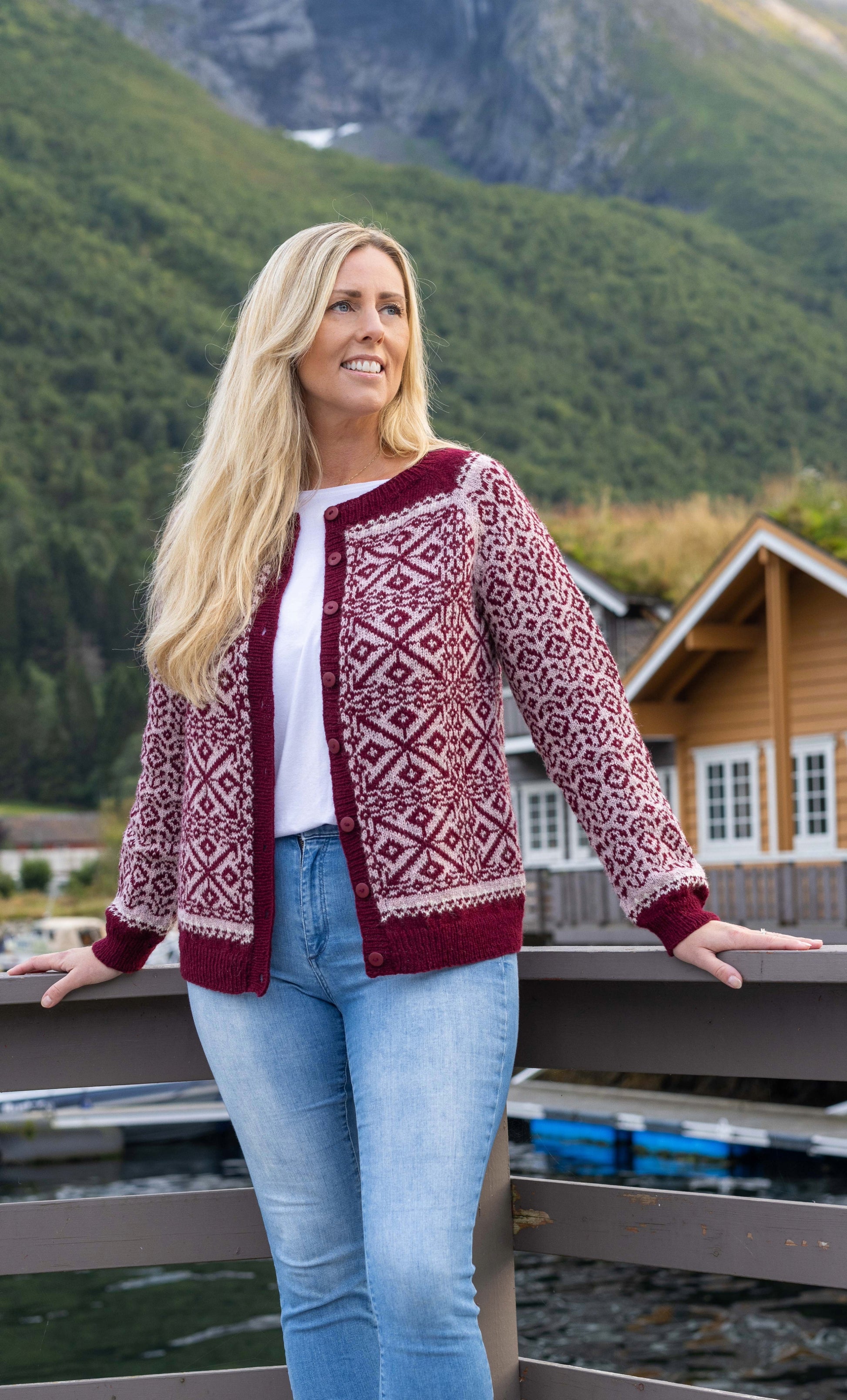 The decorative elements in the cardigan are inspired by the decorations we find inside the beautiful church in Sæbø from 1880. Until 1920, it was the only church in the Hjørundfjord, and people came both by sea and by land to gather in joy or sorrow. It was not without danger either. The church was decorated by local painter Peder Urkegjerde Skår after a sketch by architect Henrik Nissen. Now these beautiful motifs can be enjoyed by new generations in the cardigan.