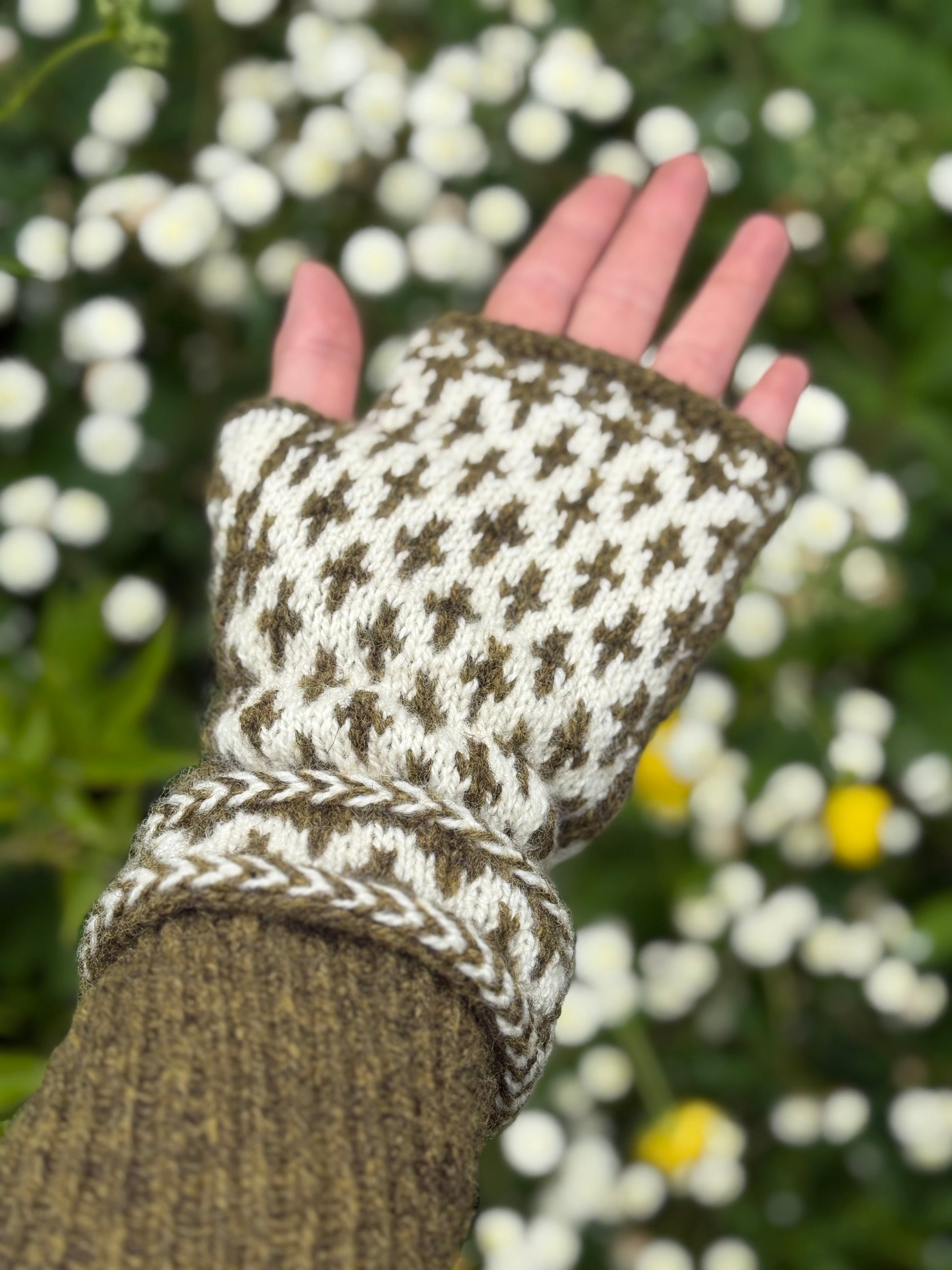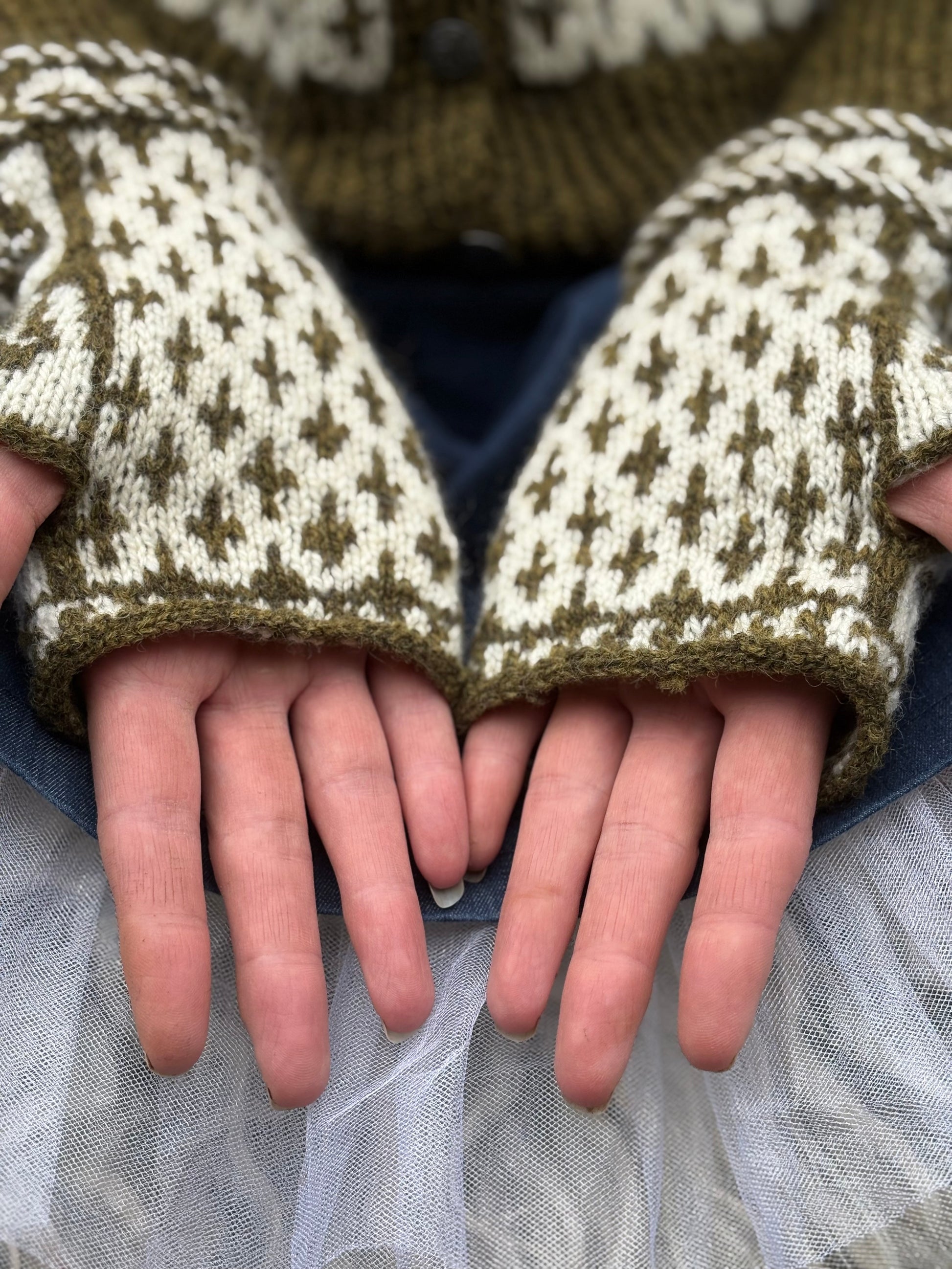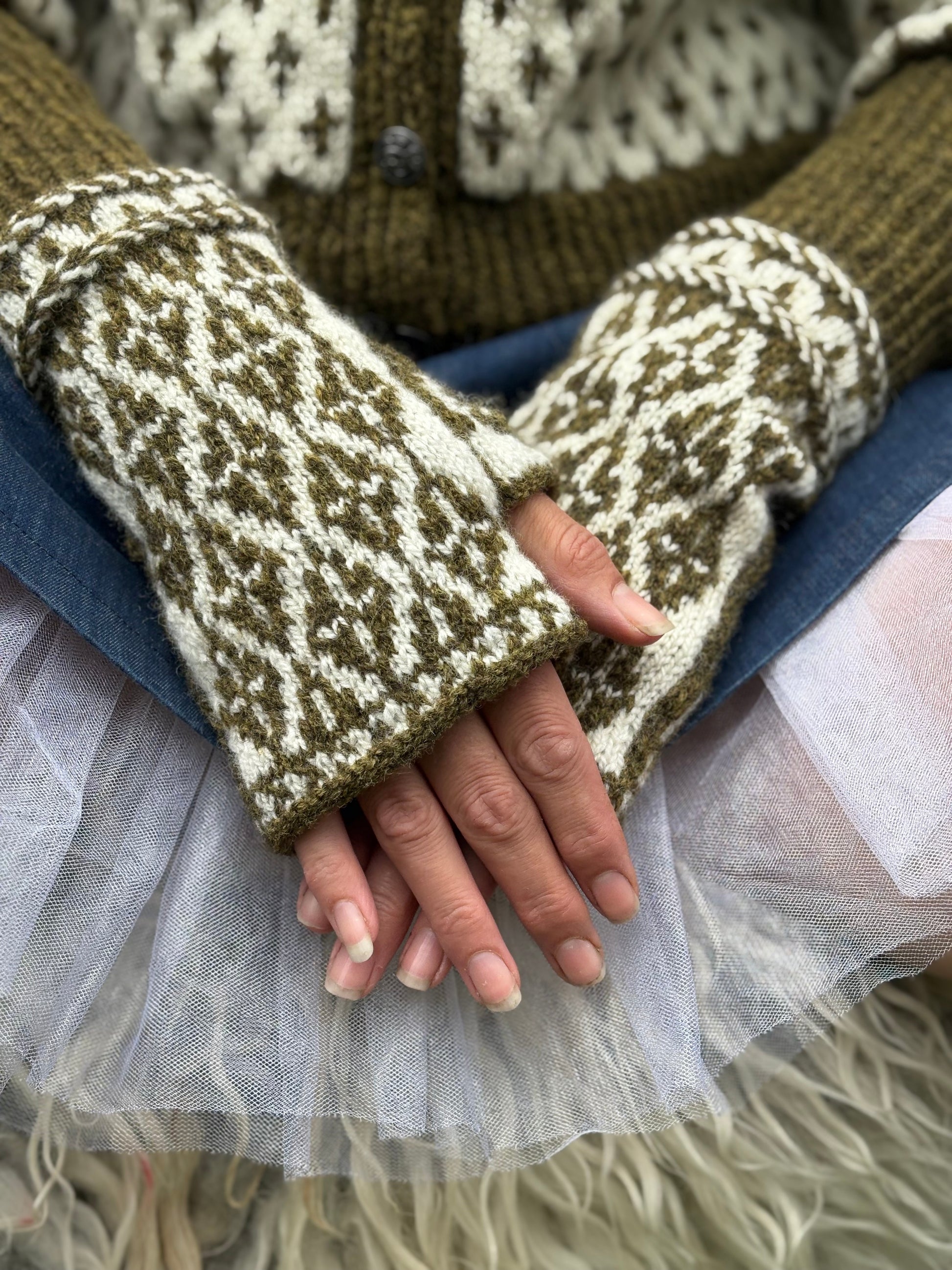 Velg mønsterfarge til Lys beige 4078 som botnfarge. For andre fargekombinasjonar skriv oss ein e-post: maritabett@hjorundfjordstrikk.no