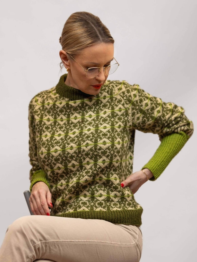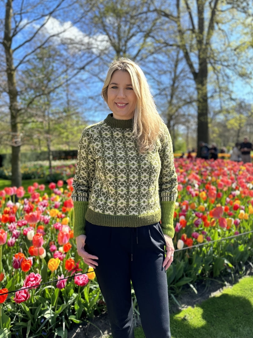Damegenser strikka i 100% norsk ull med dekorelement frå Bjørke kyrkje.
