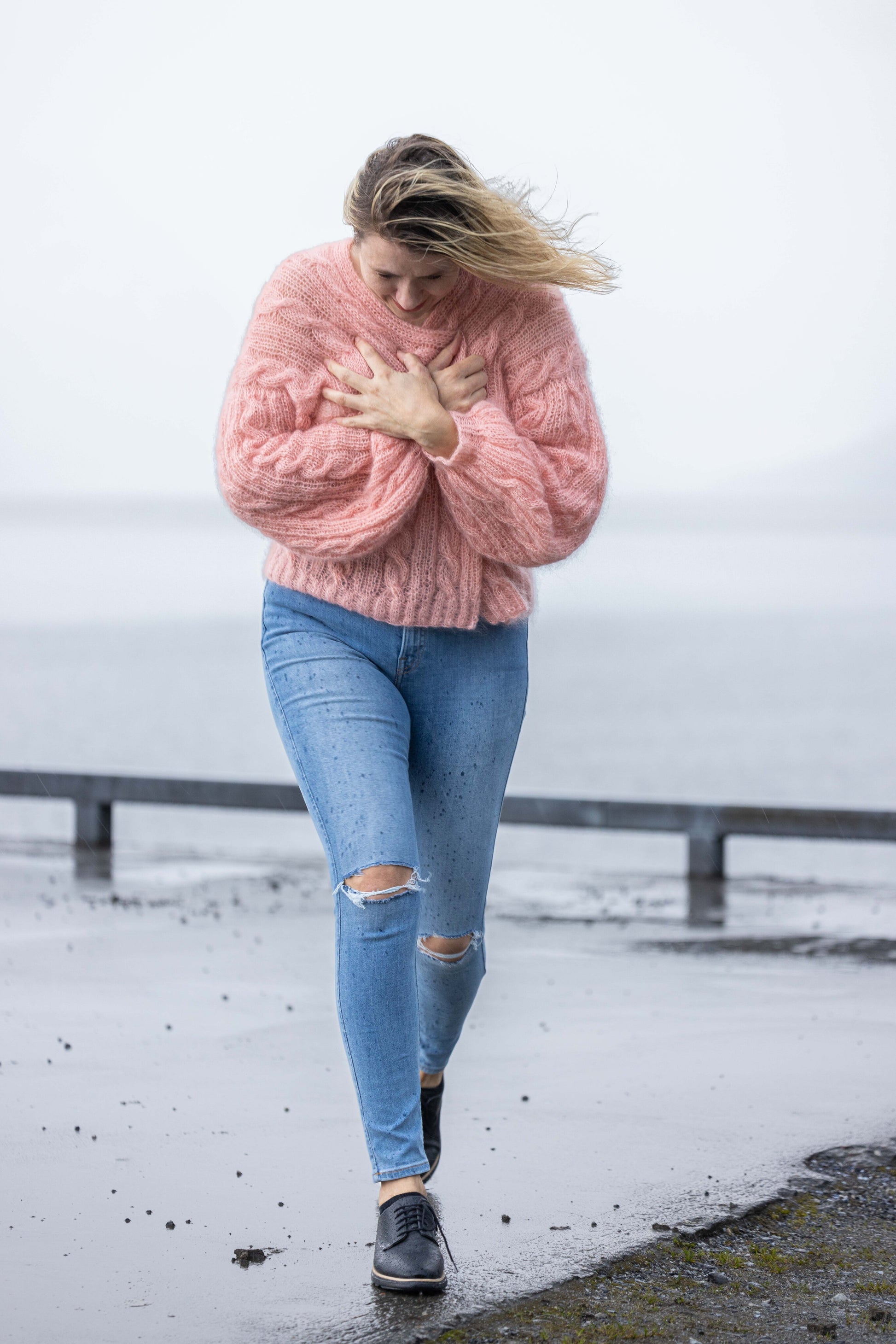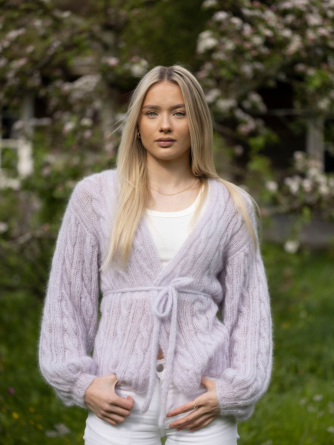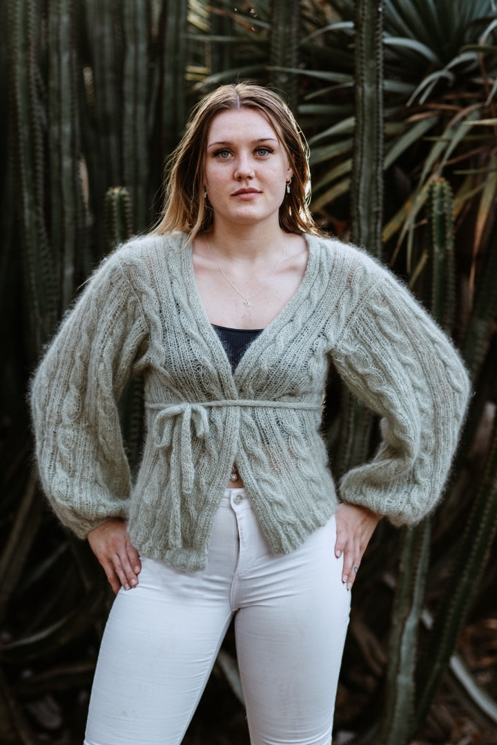 Feminin damejakke i flettestrikk med vide ballongermar.