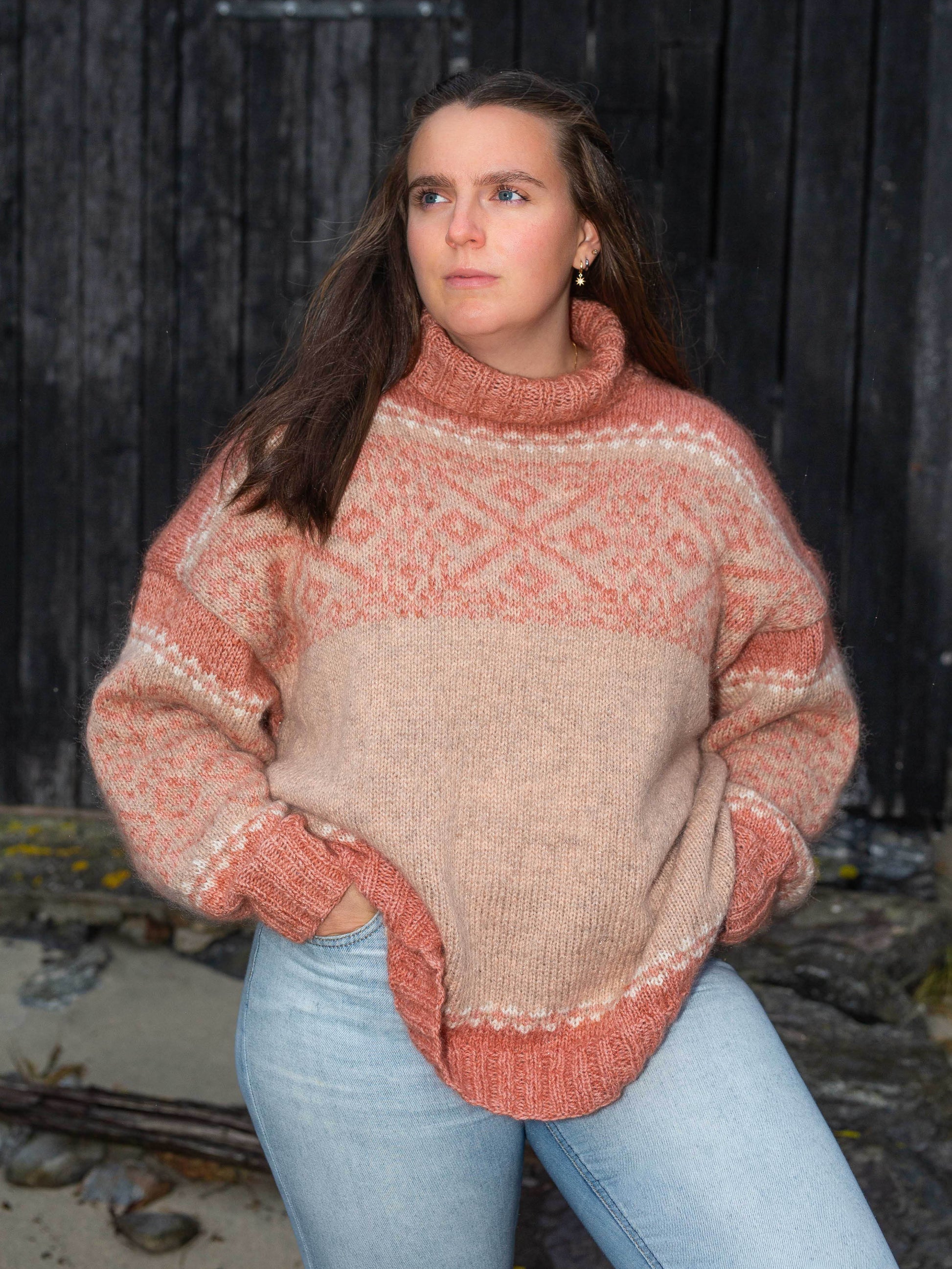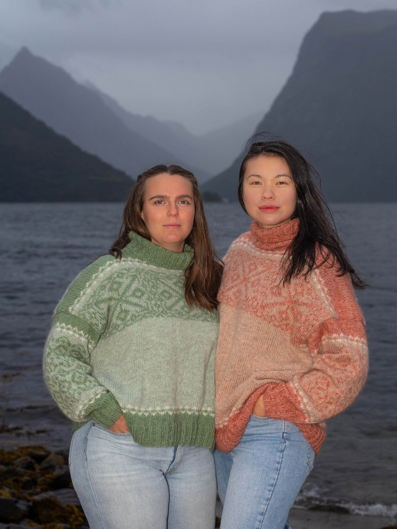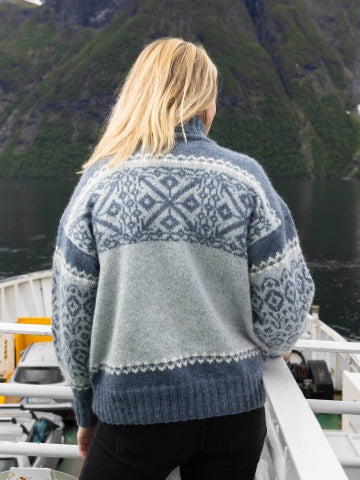 Raus og loden damegenser strikka i Rauma Finull og Plum.