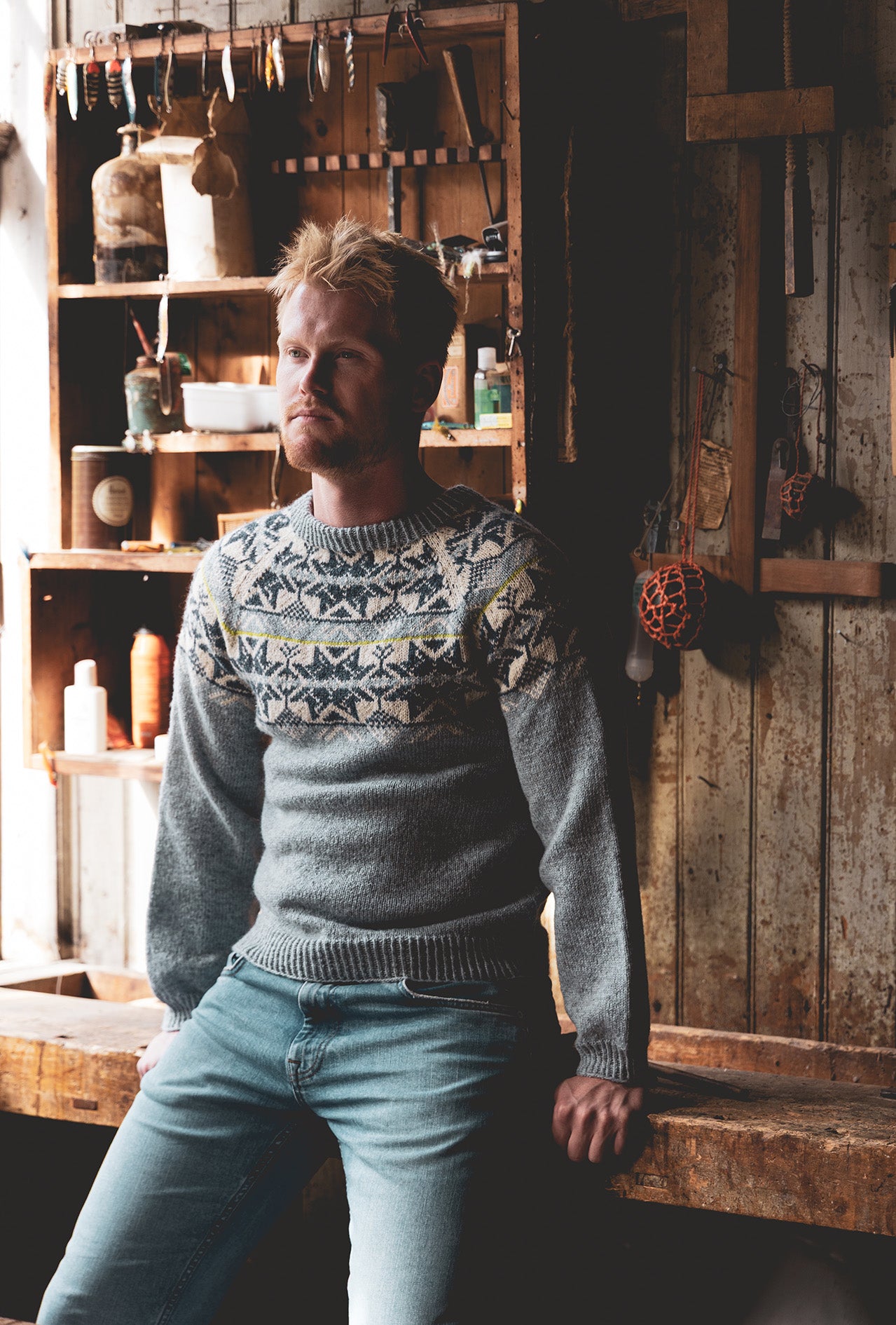 Hjørundfjordsgenseren i fargevarianten Lys blå vinter er strikka i Rauma Finull, eit garn i 100 % norsk ull, som gir eit lett og varm plagg, og som held fasongen år etter år.