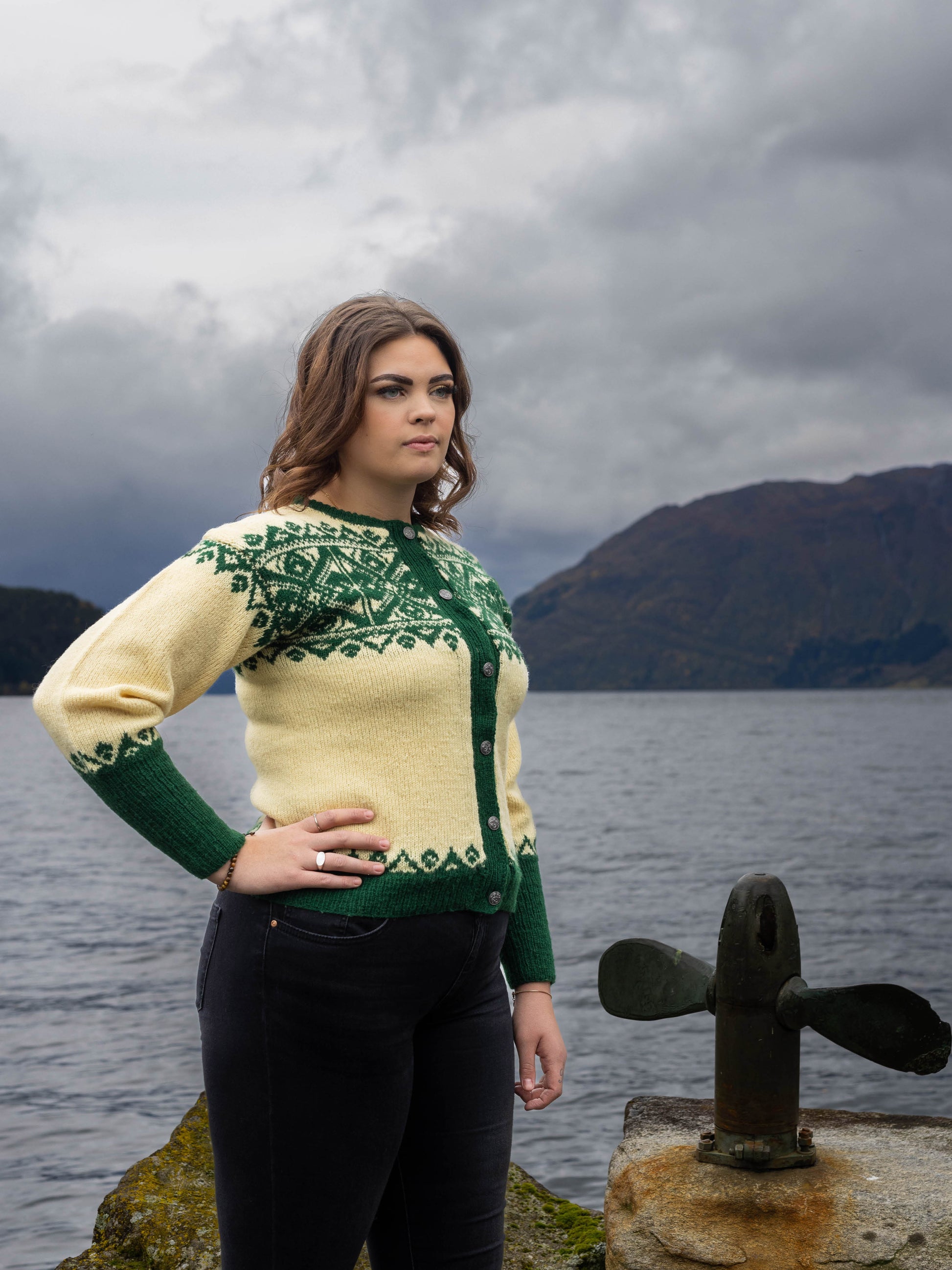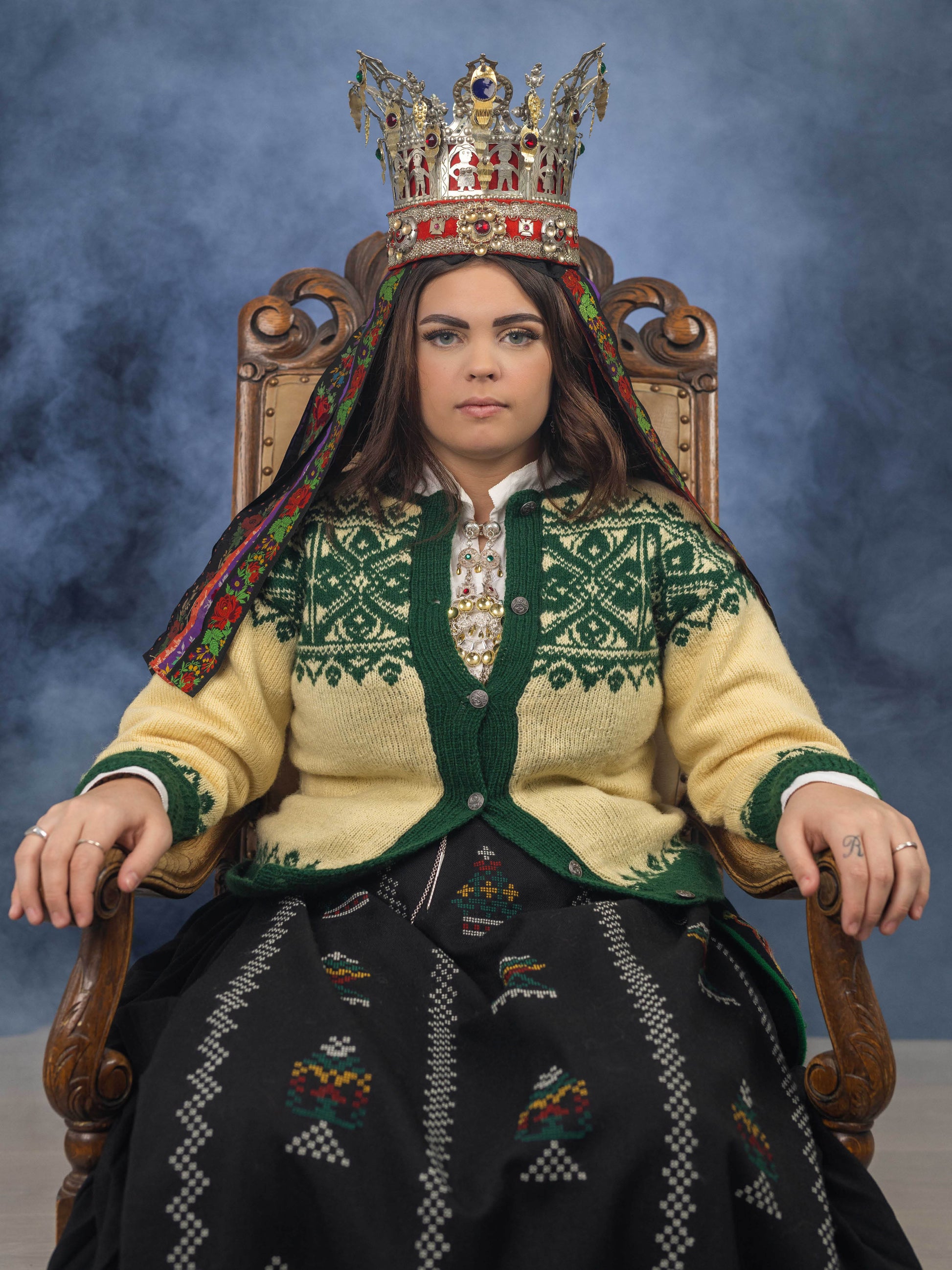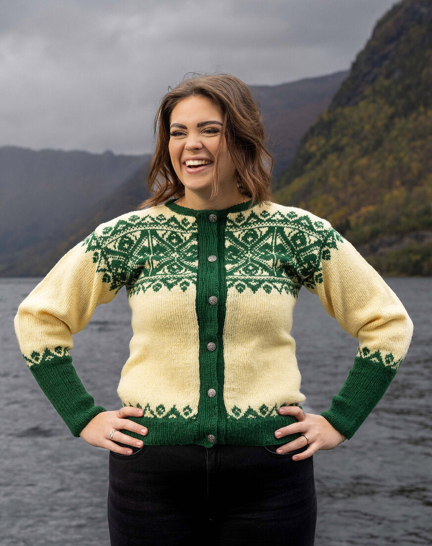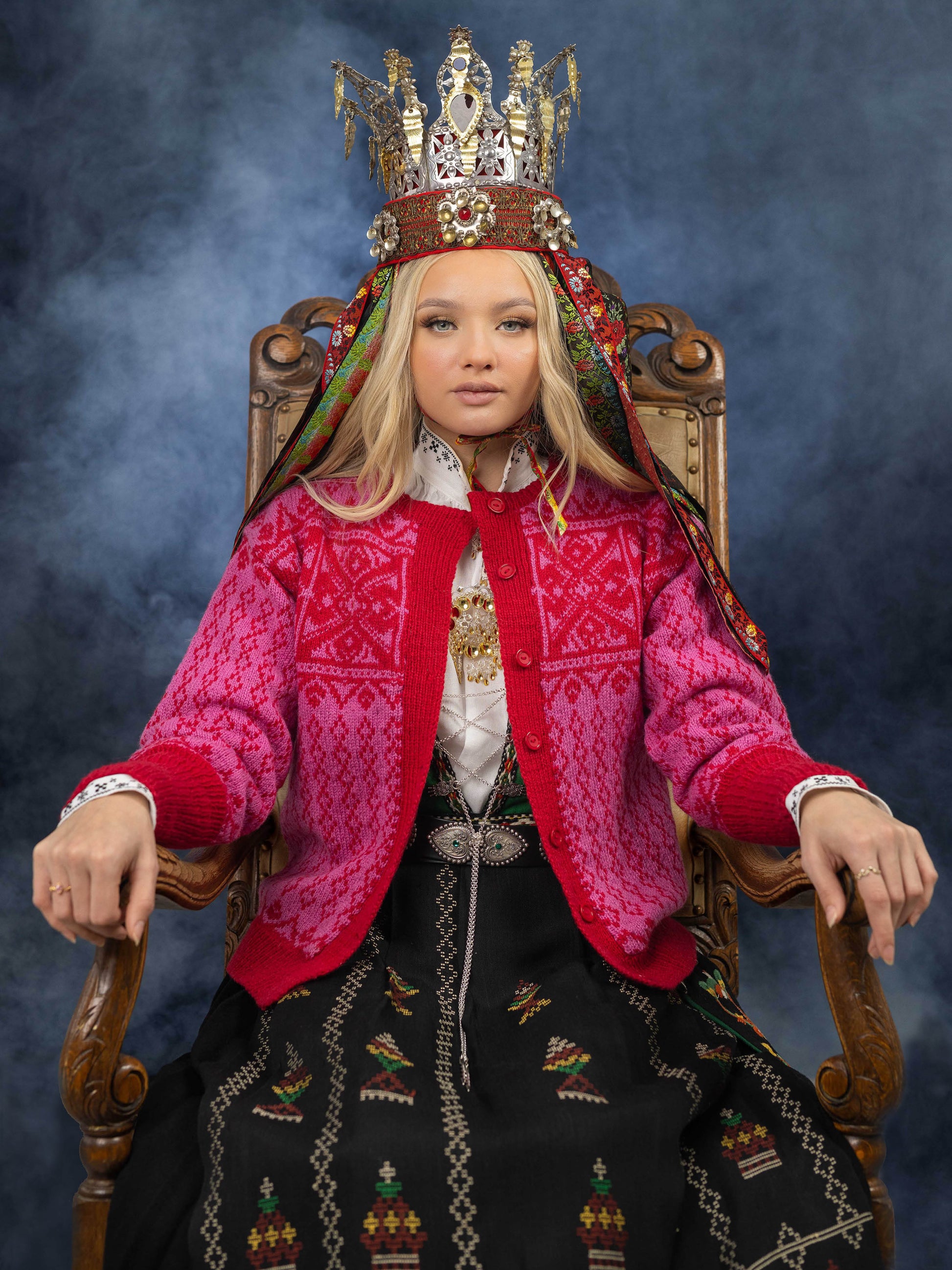 Mønsterrapportane på bringa er inspirert av dei vakre brudekrunene frå Hornindalen.