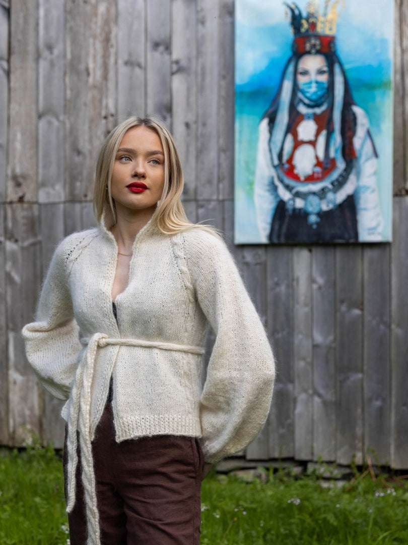 Øyejakka er ei midjekort og feminin jakke der inspirasjon til forma er henta frå bunadskjorta til Sunnmørsbunaden. Broderiet på ryggen er inspirert av bunaden til Petrine Myrhol g Øye (f. 1868), som budde på Øye i Norangsfjorden. Det er sjølvsagt valgfritt om du vil brodere på blomane på ryggen på kofta. Tips til brodering står i mønsteret.