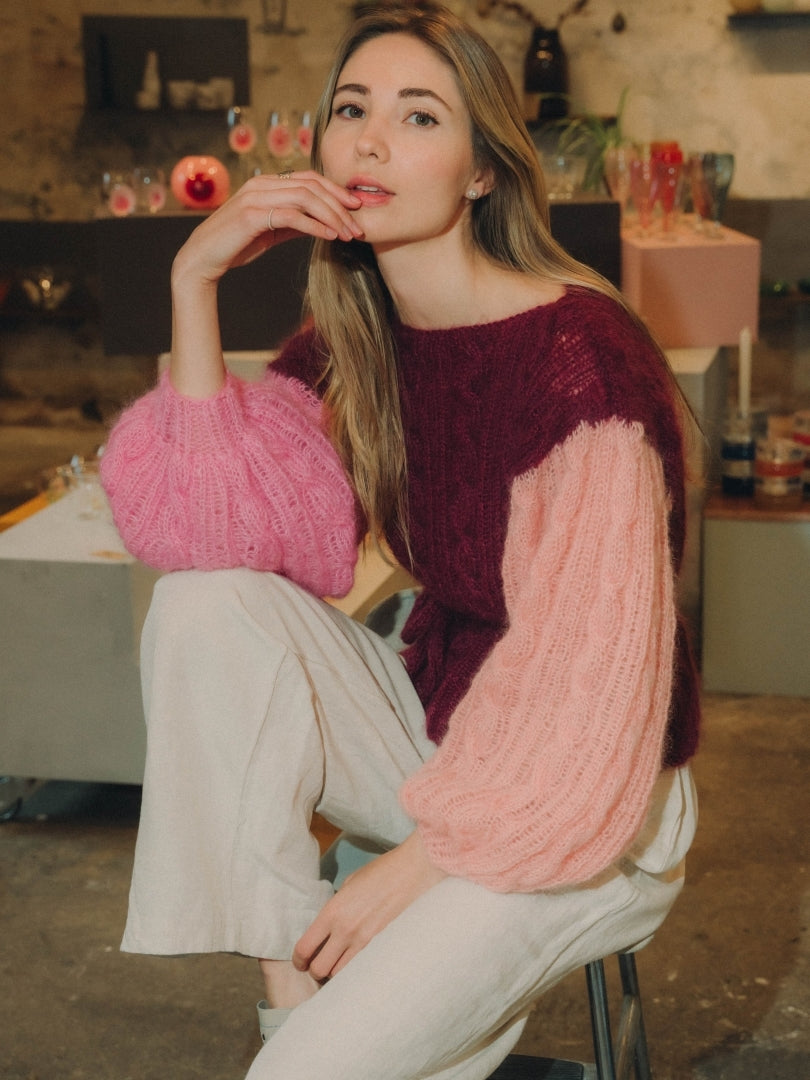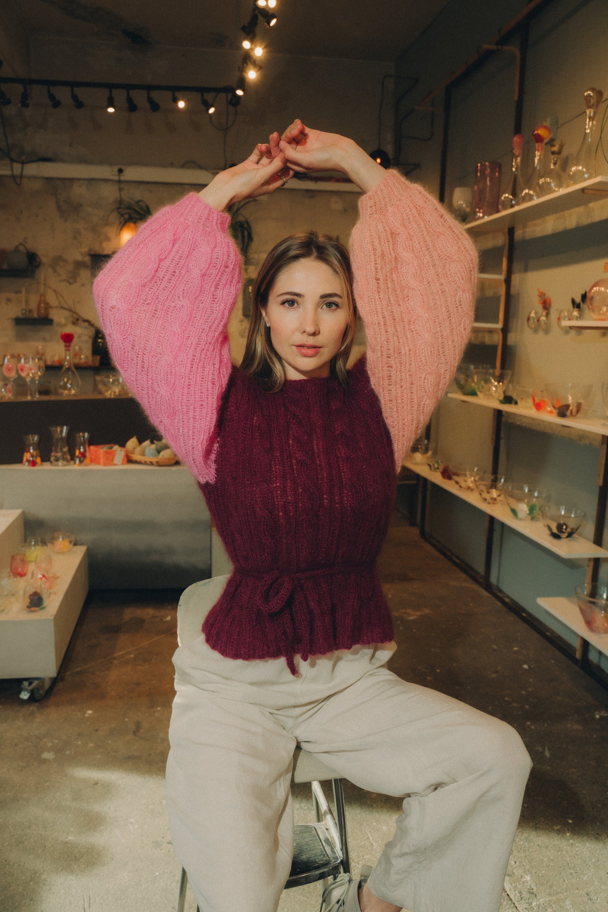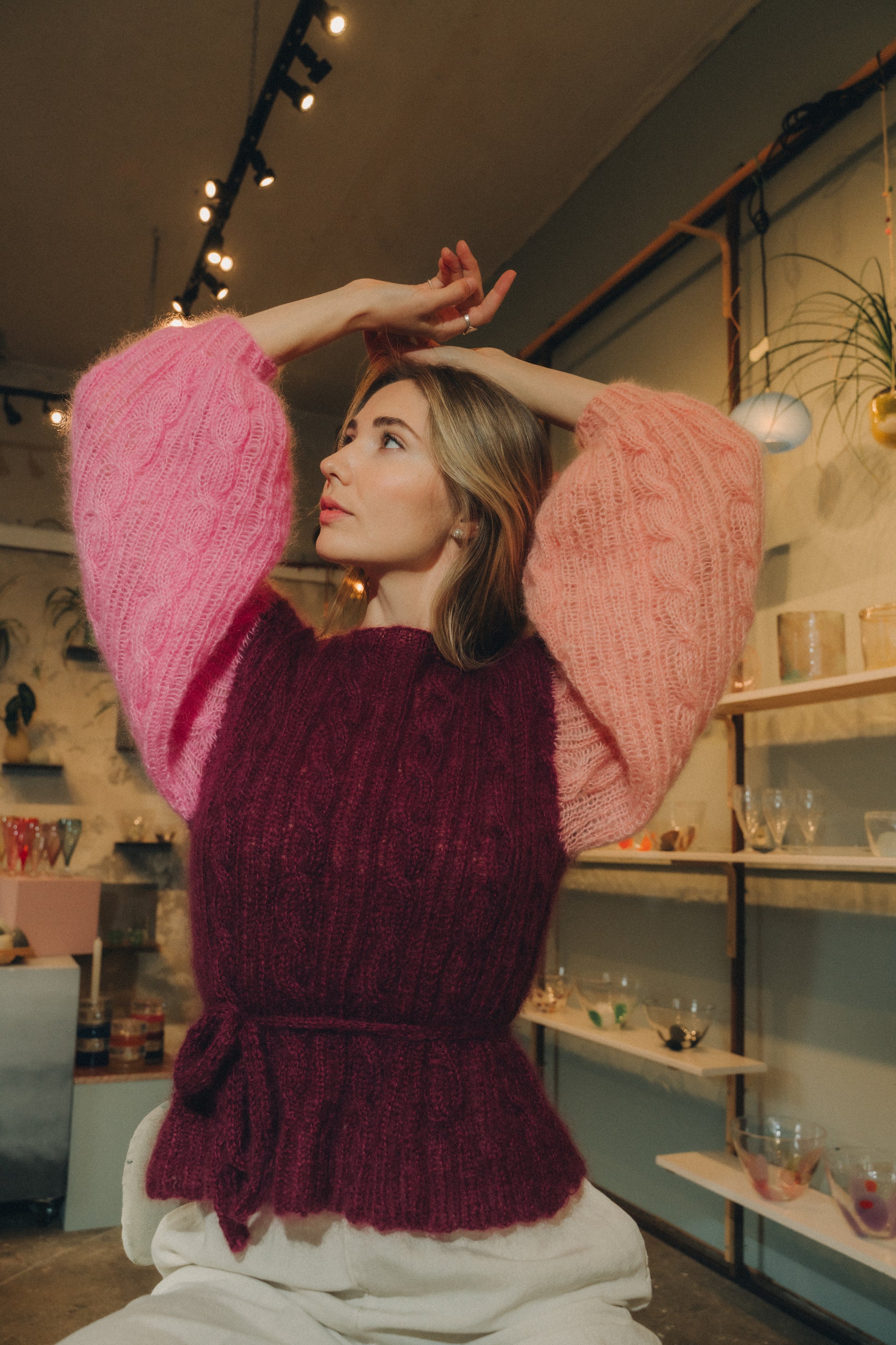 Genseren er strikka i 3- trådar Plum (25 g) frå Rauma Garn, holdt saman på pinne nr 5 på vrangbord, og på p 6 elles. Genseren har knytebelte som kan knytast på sida eller framme, under bysta eller i midja, alt etter kva som passar deg best. Genseren er strikka nedanfrå og opp, med samansydde skuldrar. Deretter plukker ein opp maskar rundt ermholet og strikker ermane. Til slutt strikkast knytebeltet.