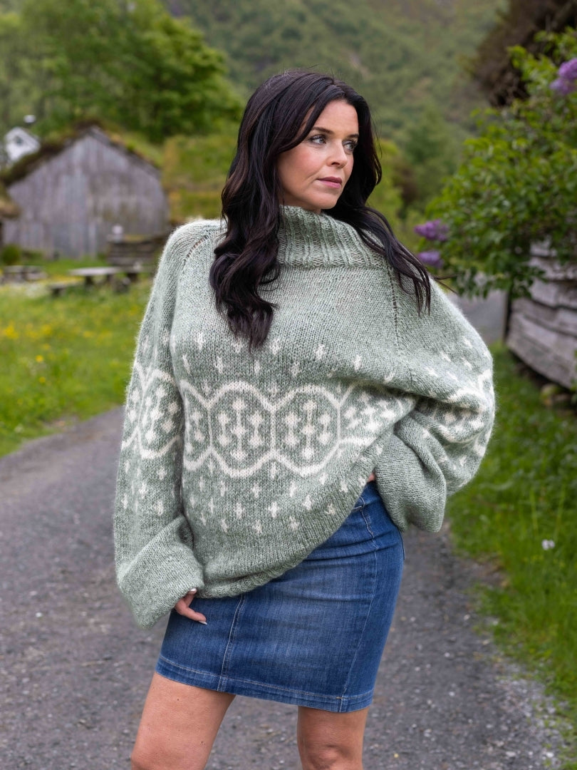 Designet inviterer til at du som strikkar kan tilpasse modellen etter eige ønske. Du kan sjølv velge lengd på både ermar og bol. Det er heilt opp til deg korleis du vil strikke halsen. Høg eller lav, 2 r, 2 vr eller 1 r, 1 vr. Storleiken til dette mønsteret er laga etter den blå genseren som Martine har på seg, og er ein M. Garnpakken inneheld nok garn til høg hals.